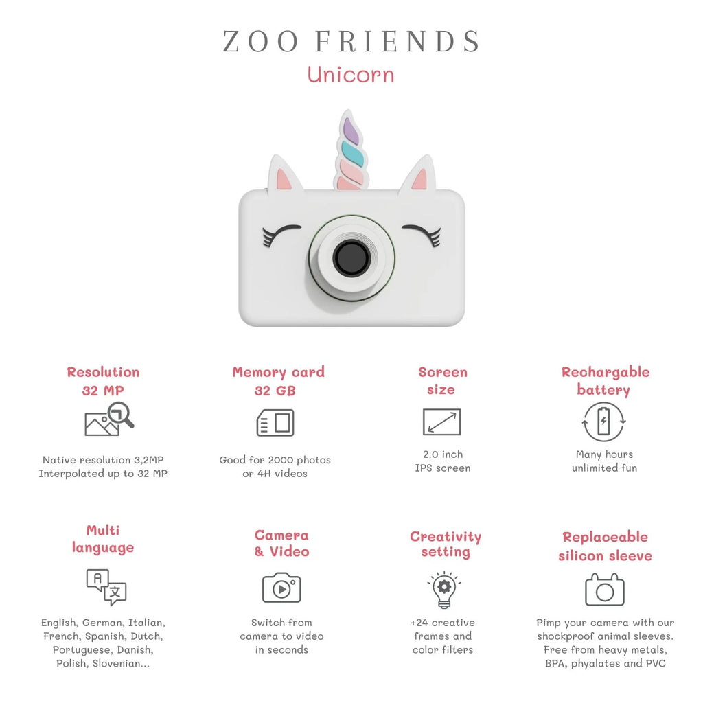 This unicorn designed 32 megapixel digital kids camera and video recorder from The Zoofamily is extremely cute, small and lightweight. Personalize your kids camera with stickers and even 20+ camera digital filters and frames.