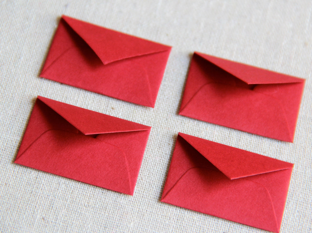- Packaged in a clear sleeve. Set of 12 tiny envelopes,hand-assembled from red acid-free paper.