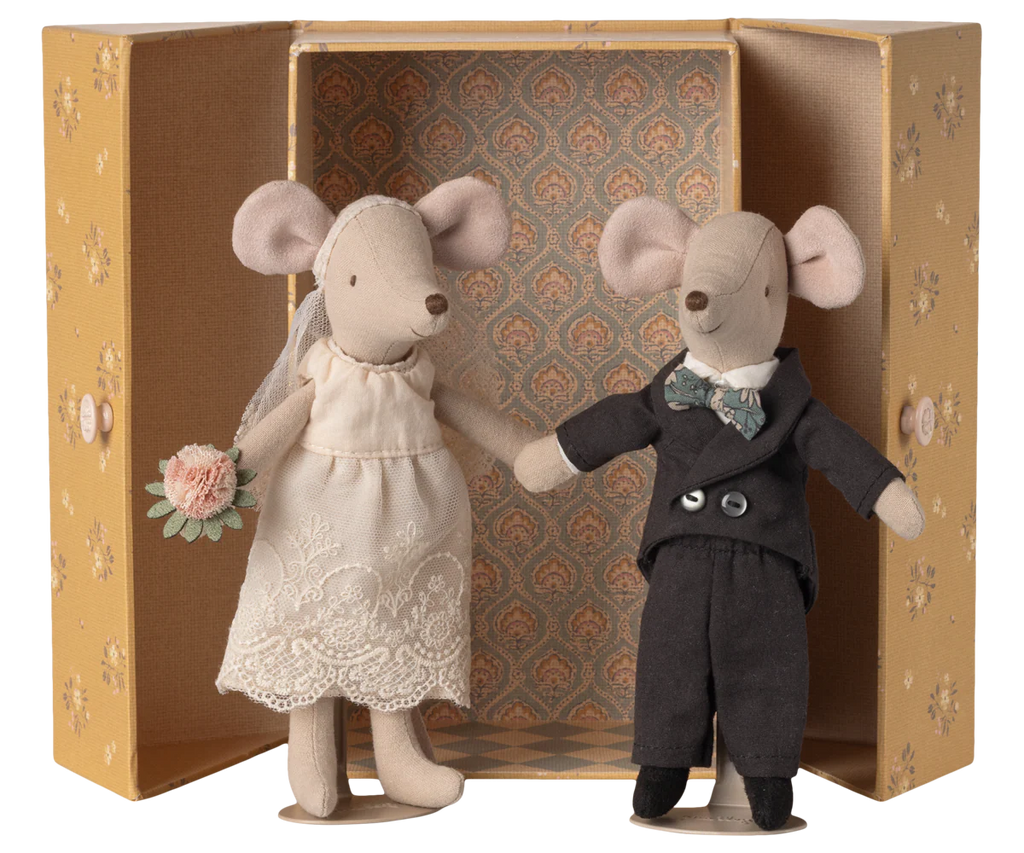 A beautiful love story that starts on the wedding day of these two mice. They are dressed classically in a long white dress, lace veil, bouquet and tuxedo. They come in a beautiful box decorated with Maileg print.
