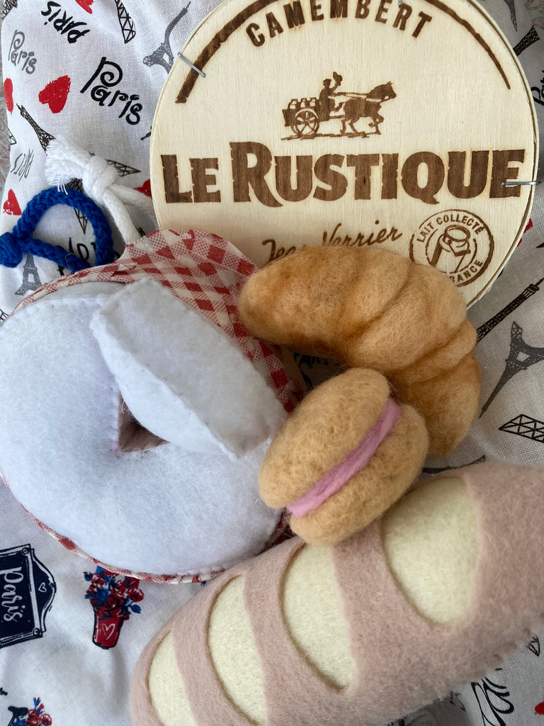Enjoy a Parisian picnic with these beautiful hand made felt foods. Each set comes in a French themed bag and includes a baguette, macron, croissant and Camembert! These one-of-a-kind creations make the sweetest one-of-a-kind gift to bring back to your children from Paris.