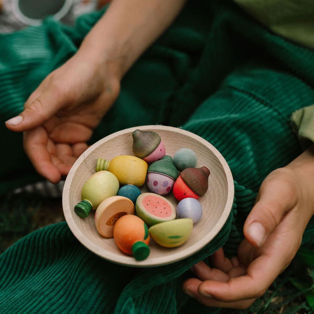 Have you ever tasted the colors of a rainbow? These hand-painted wooden fruits by Grapat invite children to explore a colorful world full of bright shapes and bold colors. From plump berries to citrus fruits, each piece inspires picking, sharing, and mixing, encouraging symbolic and open-ended play.