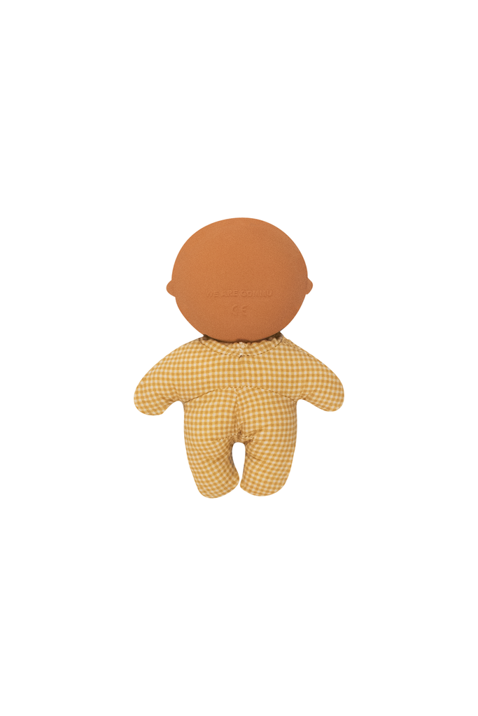 Featuring a soft head made of hevea rubber and a body crafted from cotton canvas and linen with a cheerful VICHY MUSTARD PRINT, this delightful mini doll is perfect for on-the-go adventures. Its gentle texture ensures it remains soft against your little one’s skin, making it ideal for snuggles and nurturing moments.